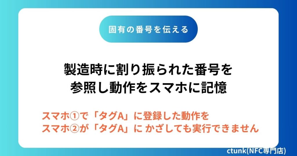 この固有の番号(シリアルナンバー)をスマホ側に覚えさせ、この番号のタグを読み取ったらスマホ側でこの動作をするなどの設定が可能になります。