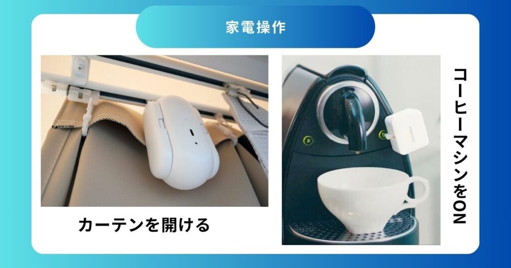 朝起きてタグをかざしたらカーテンを開けて、指ボットでコーヒーメーカーのボタンを押し、入れたてのコーヒーを用意するなどのタスクが設定可能です