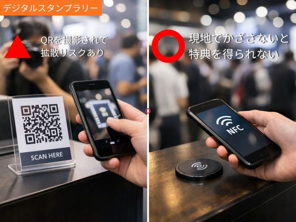 一方、NFCタグはその場で物理的にかざさないと反応しないため、画像として保存・拡散されにくく、実際に来場した人だけに特典を付与しやすいのが特徴です。