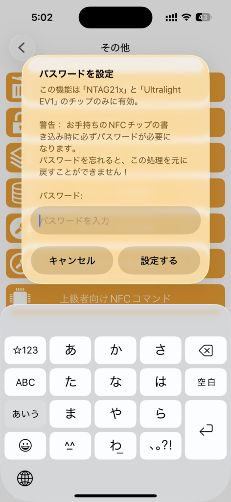 (NFCTools 書き込んだ状態でその他→タグをパスワードを設定)